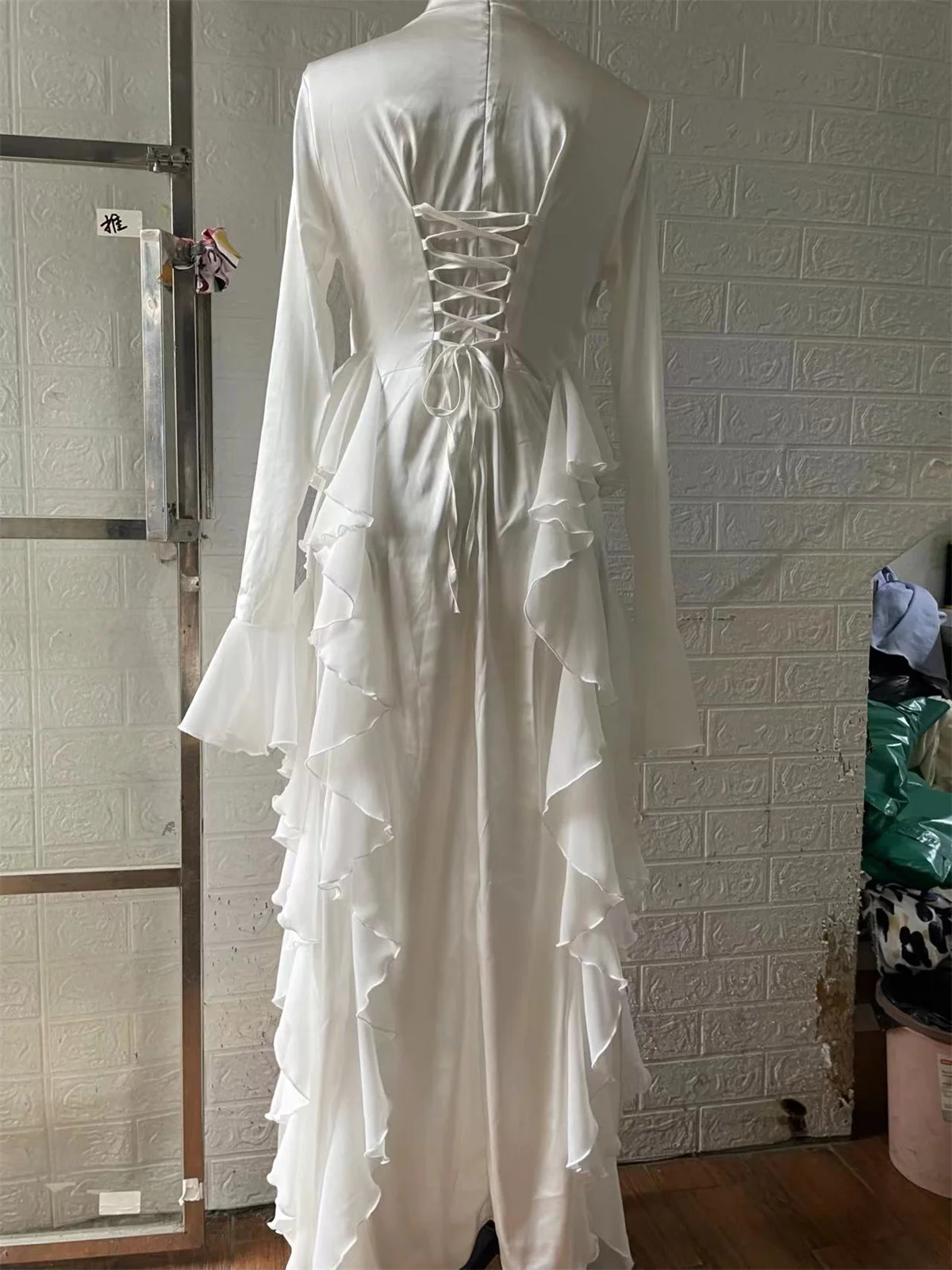 🌼 What it is - Embrace timeless elegance with our White Flared Long Sleeve Dinner Gown. This high-waisted dress features a chic O-neck design and stringy selvedge details for a sophisticated look.