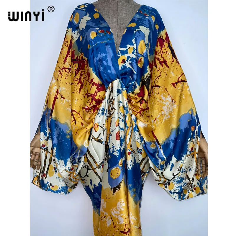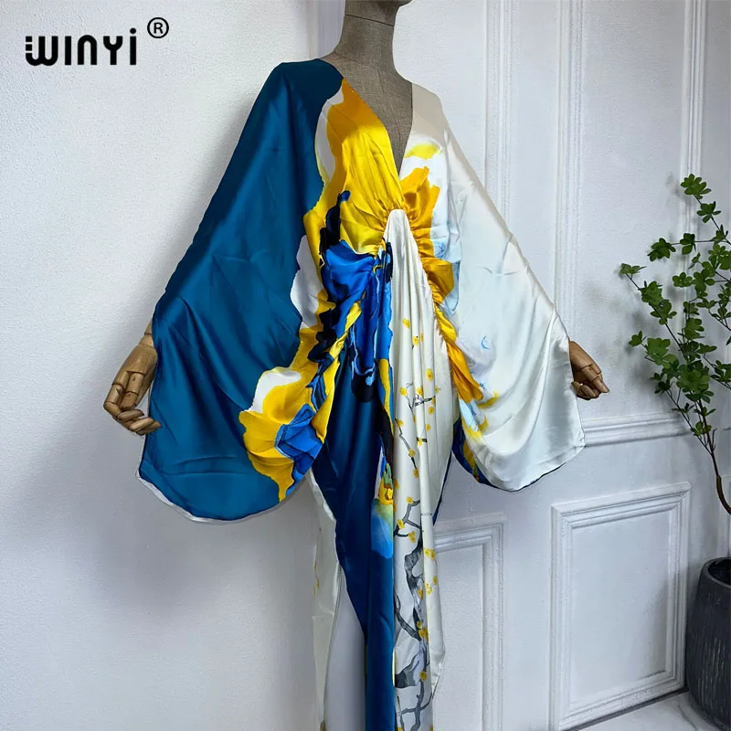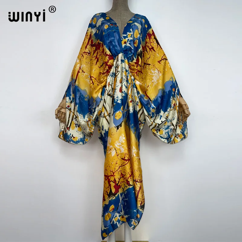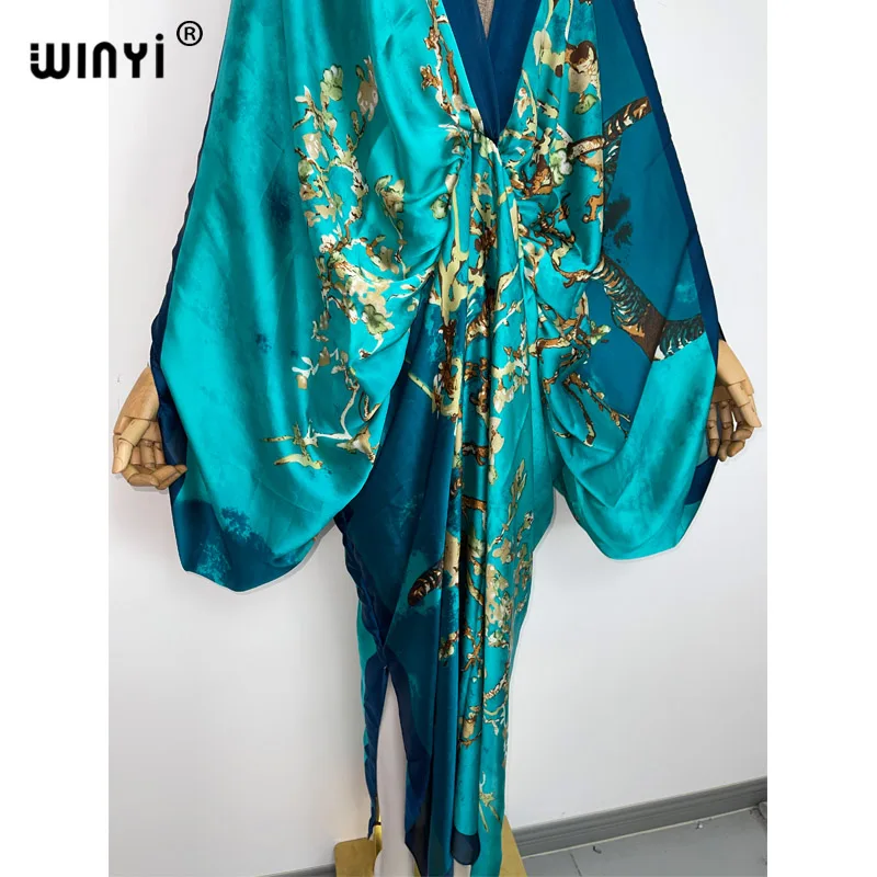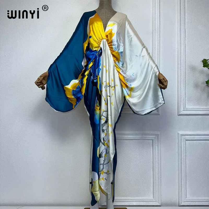 WINYI New Fashion Bohemian Deep V-neck Floral europea For Lady Free Size Loose Batwing Holiday Beach cover up Party Kaftan Dress