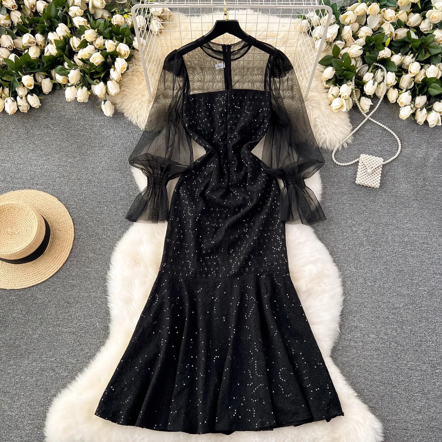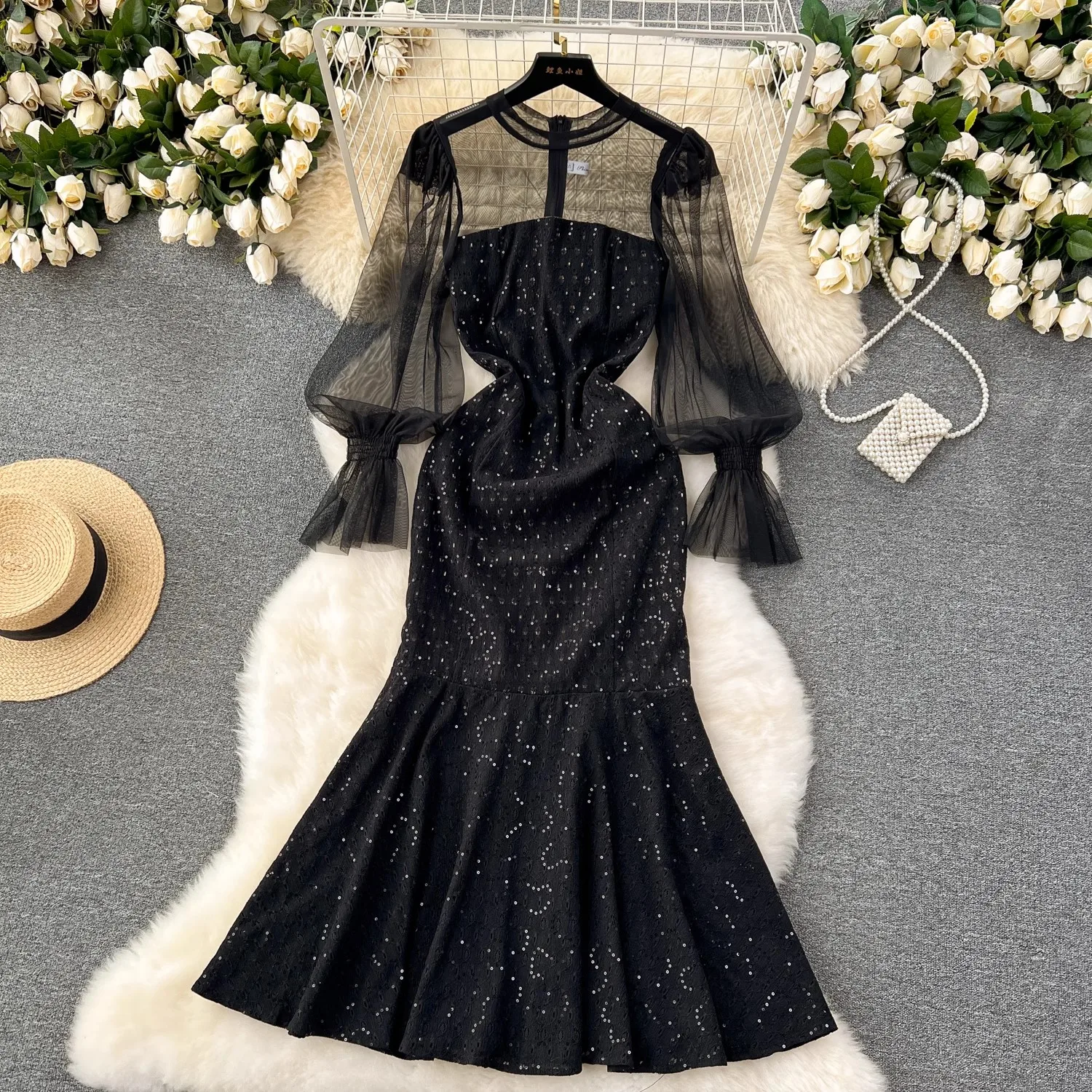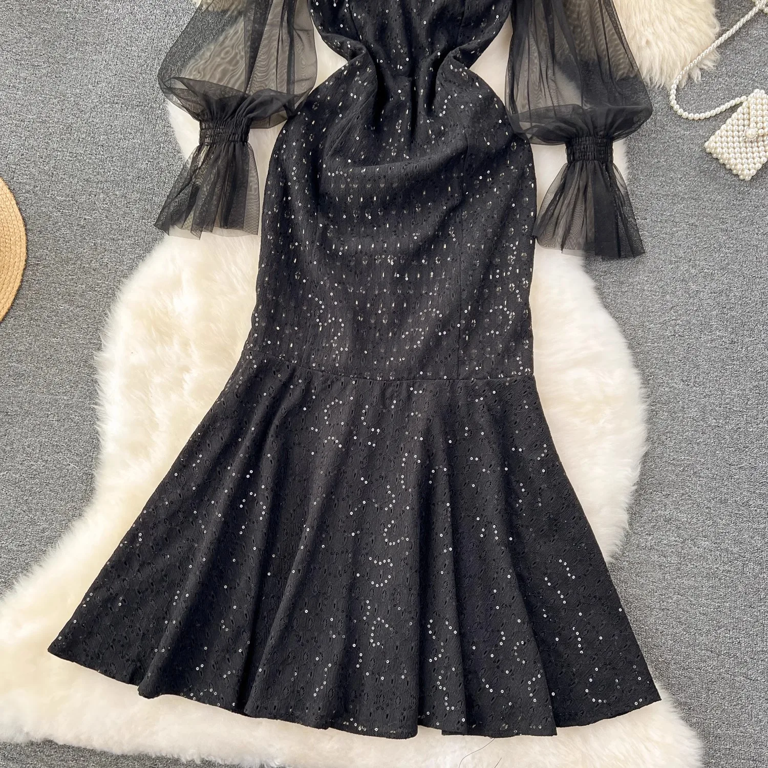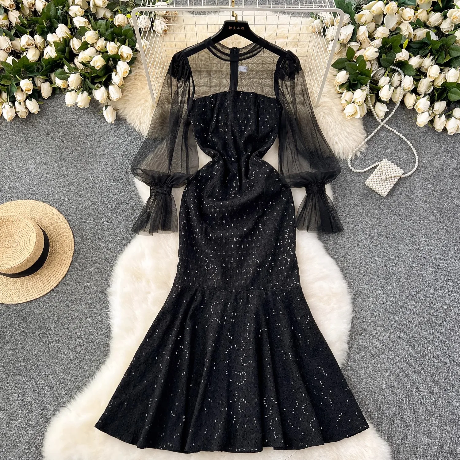 ๐ What it is - This dress is a showstopper, featuring slim patchwork design with black mesh lace, long flare sleeves, and a flattering mermaid silhouette.