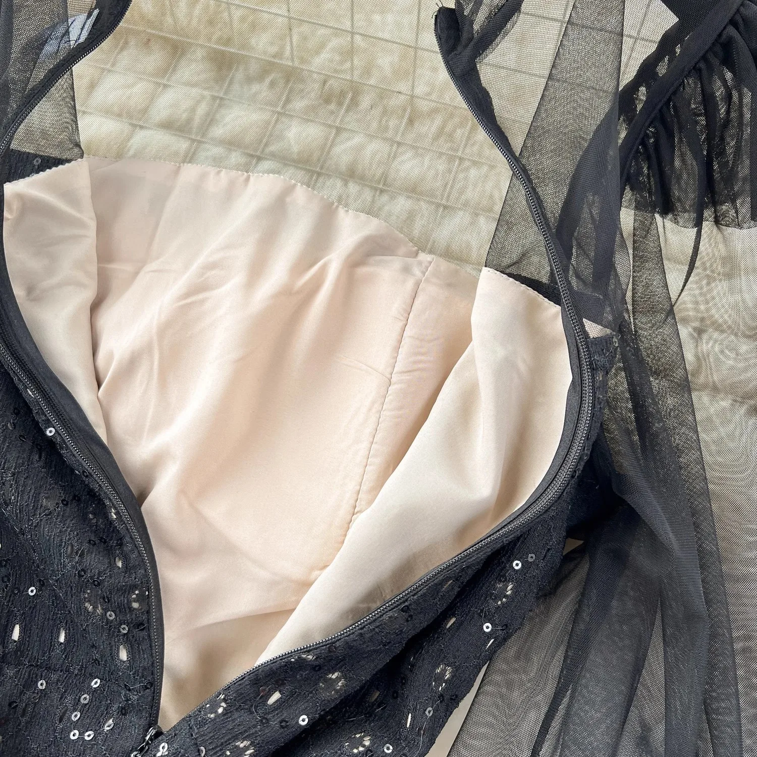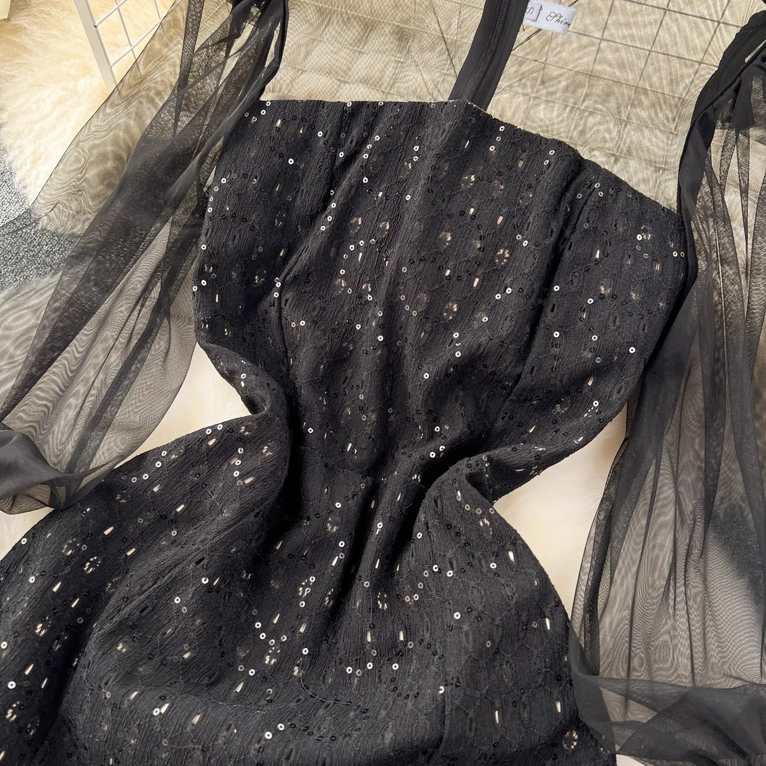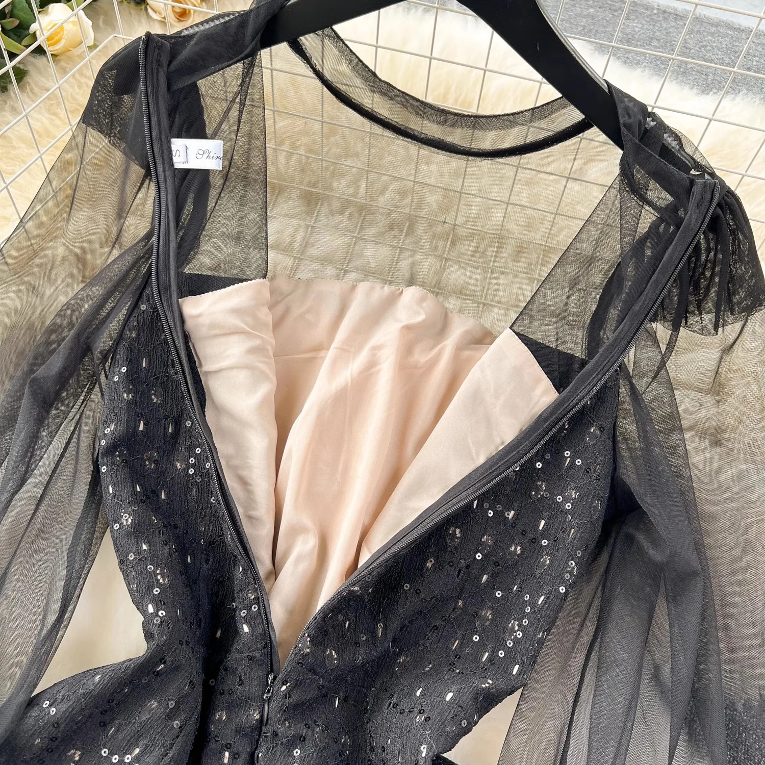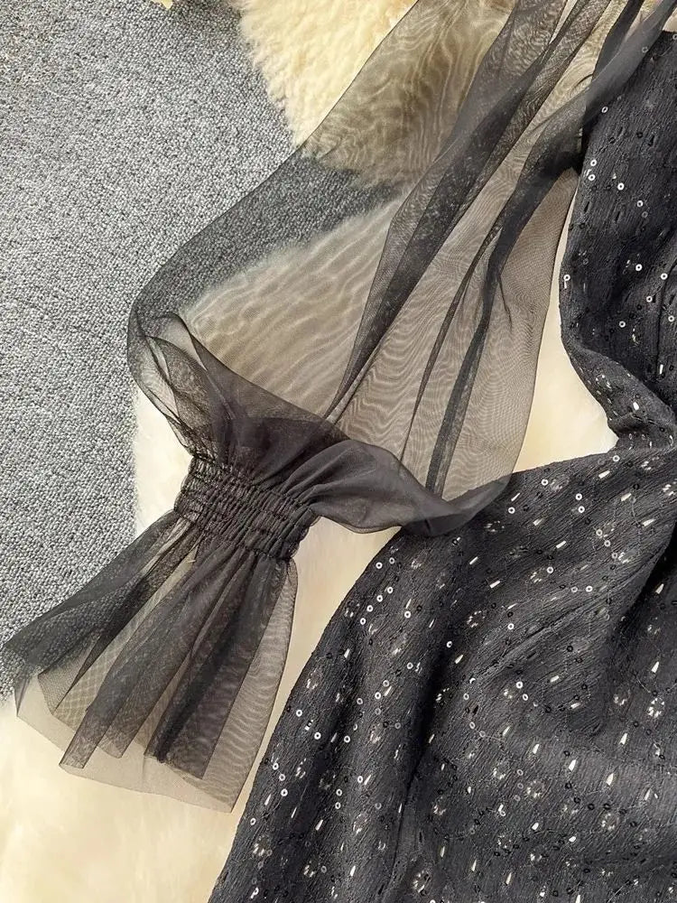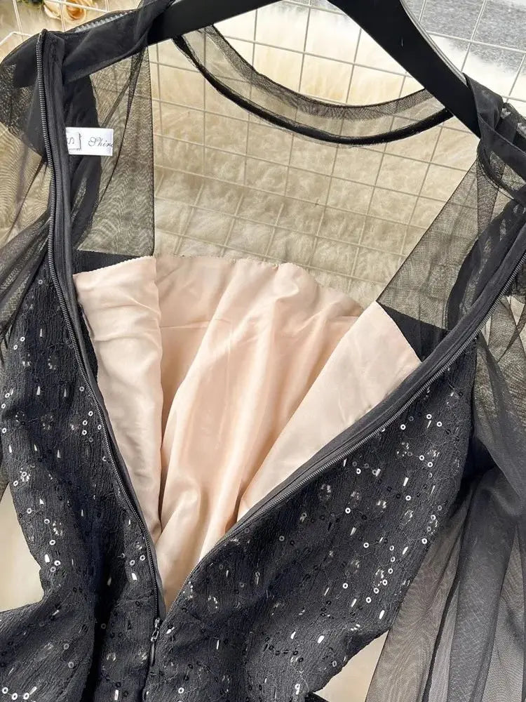 ๐ What it is - This dress is a showstopper, featuring slim patchwork design with black mesh lace, long flare sleeves, and a flattering mermaid silhouette.