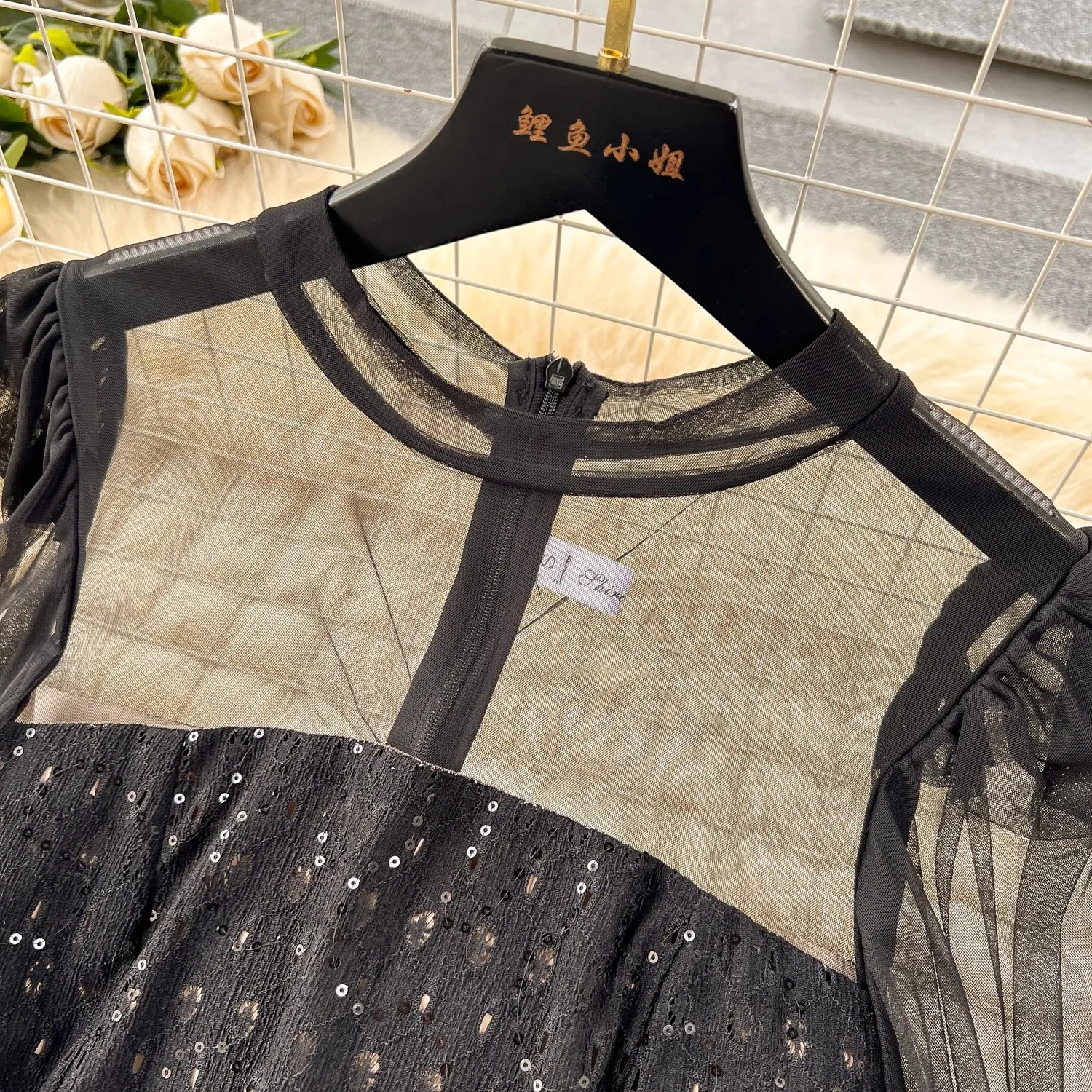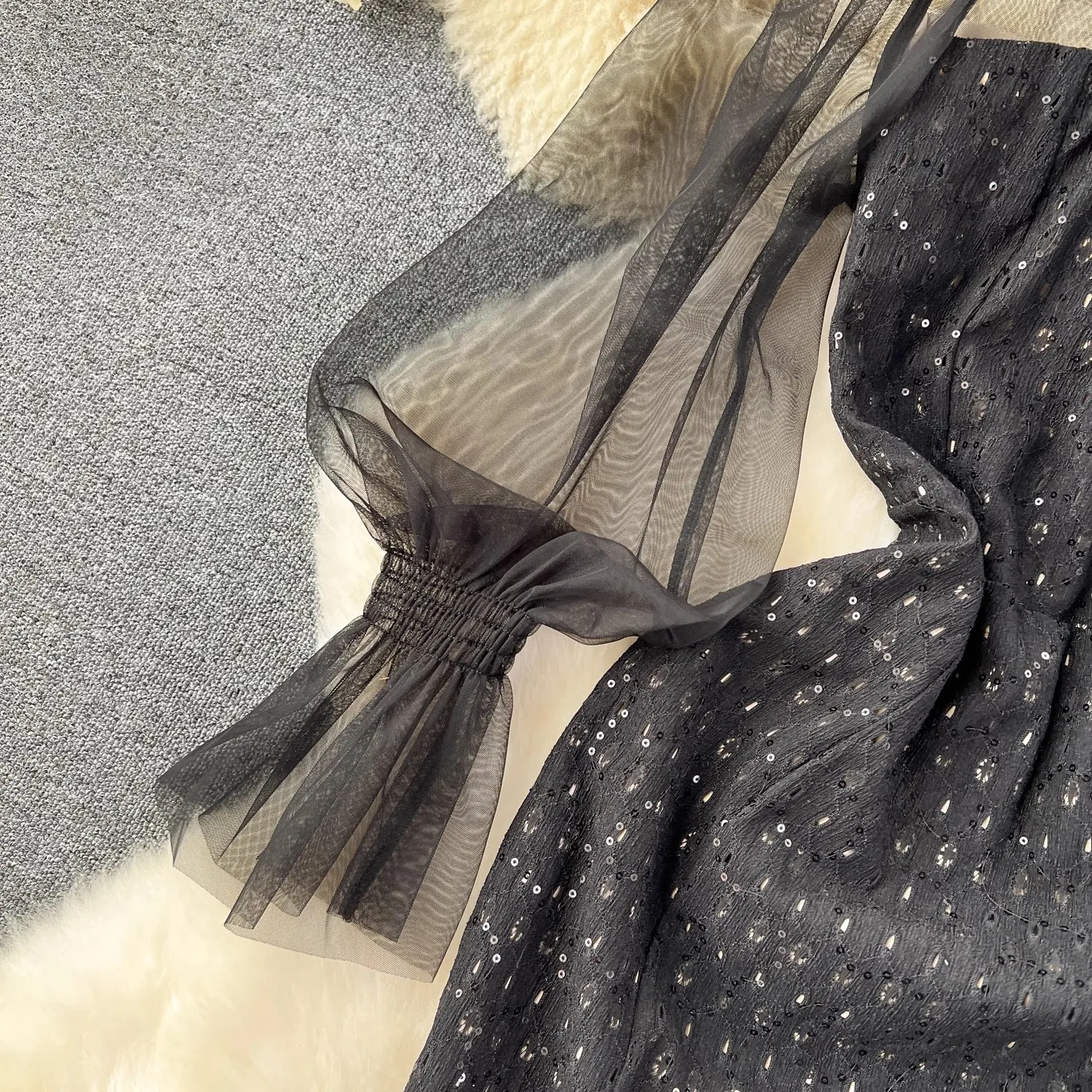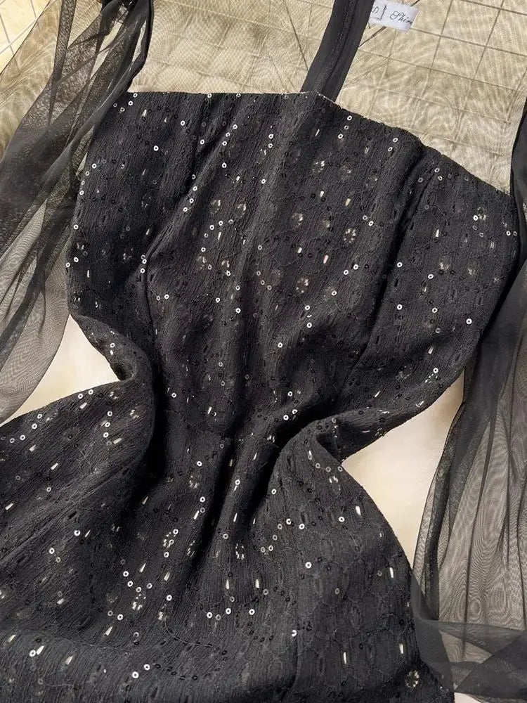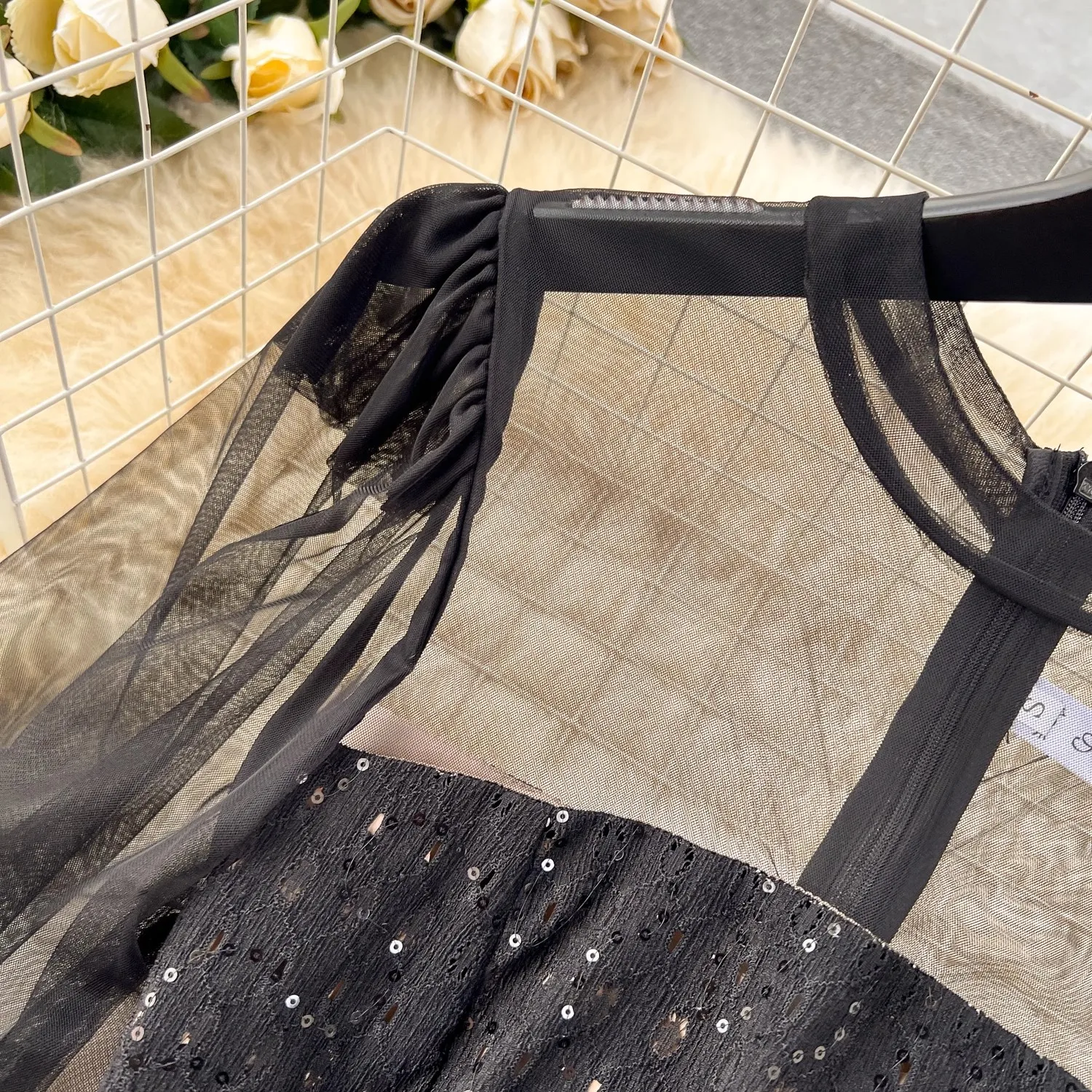 ๐ What it is - This dress is a showstopper, featuring slim patchwork design with black mesh lace, long flare sleeves, and a flattering mermaid silhouette.