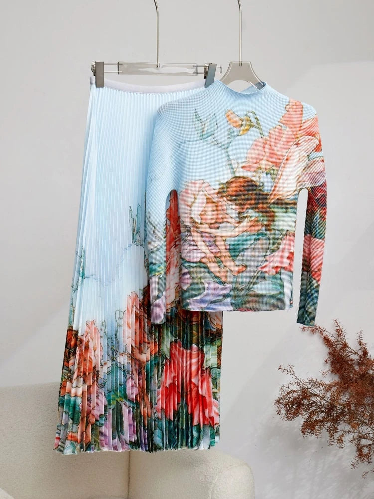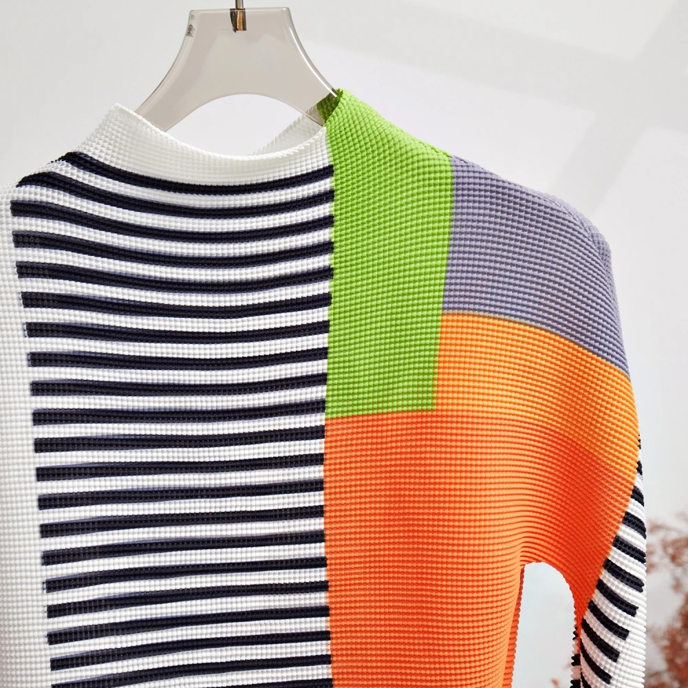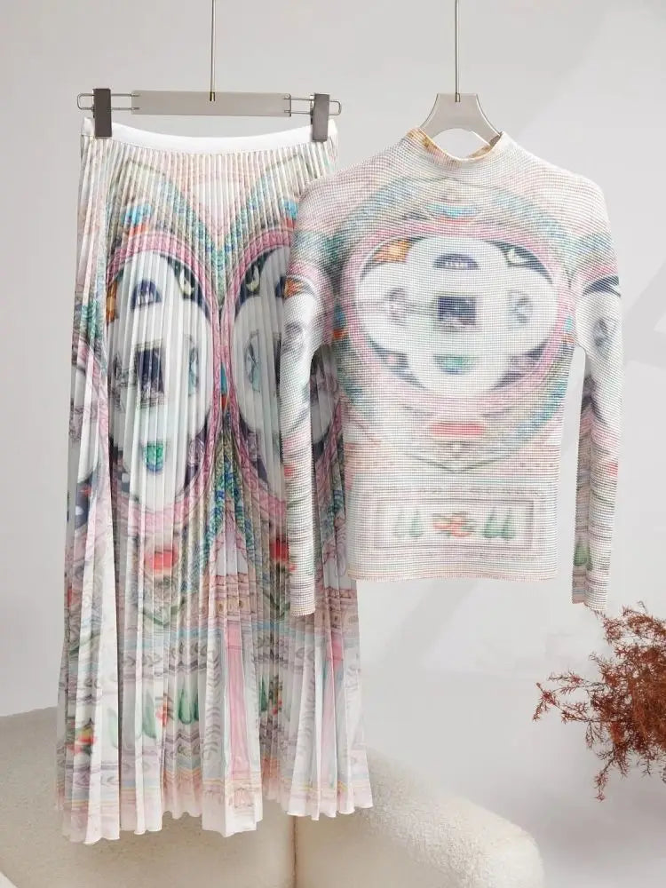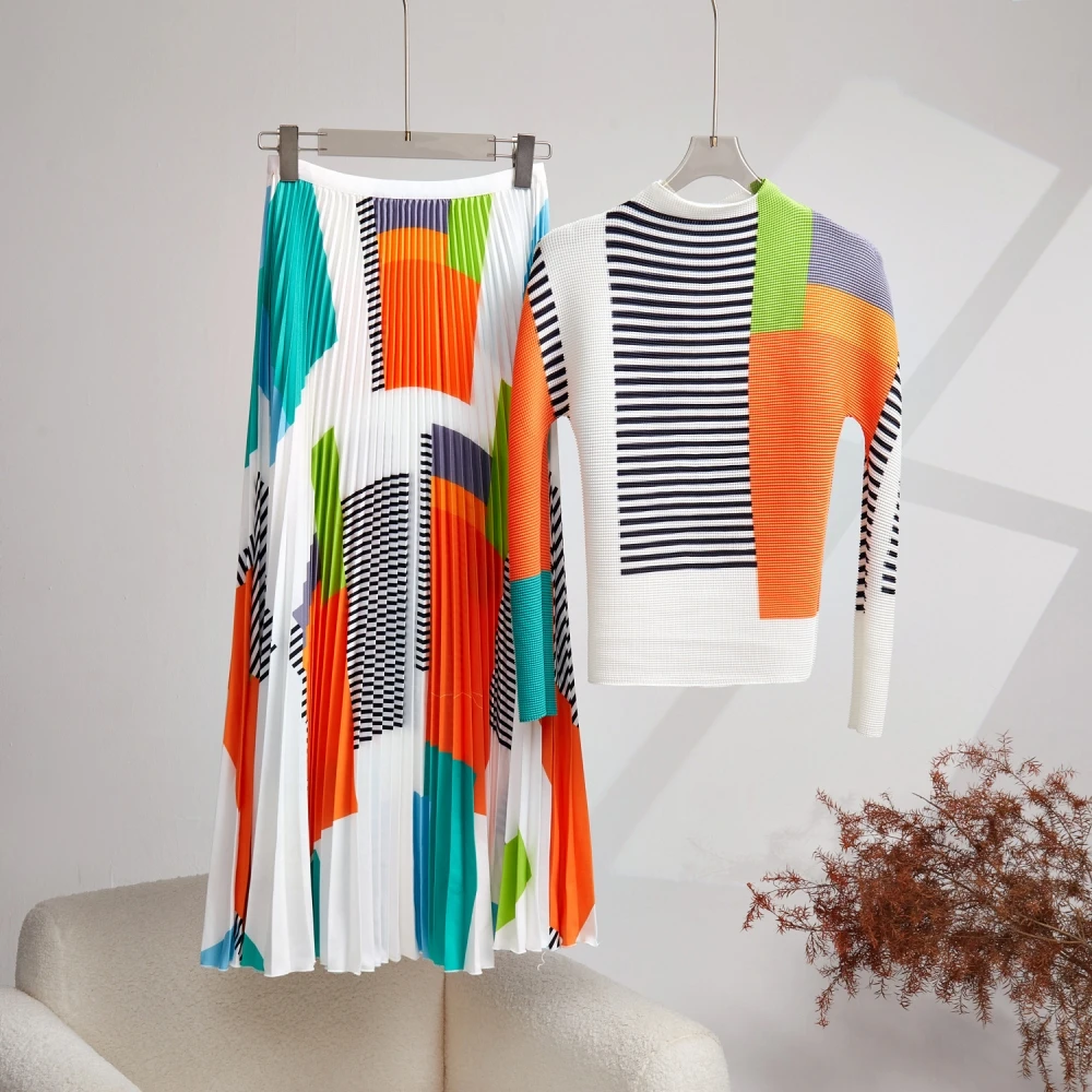 🌸 Why you need it - This set includes a long sleeve stretch T-shirt top and an elastic waist Miyake skirt, perfect for a chic and fashion-forward look. The top features a trendy jacquard striped design, while the skirt offers comfort and style with its pleated details.