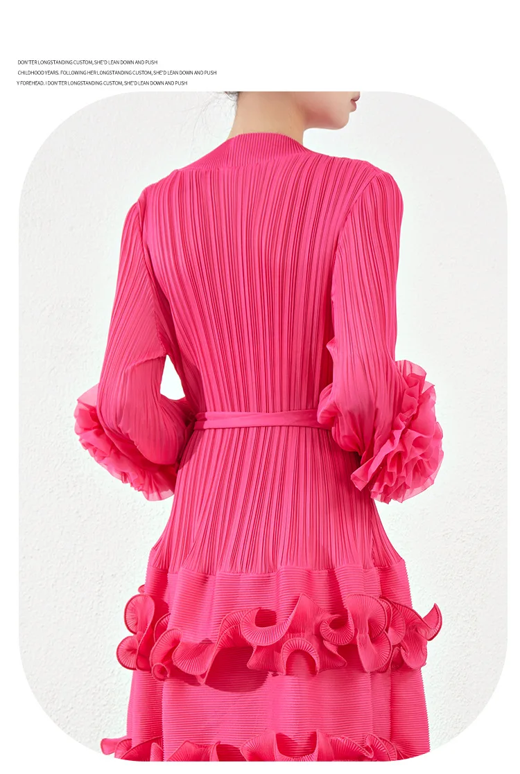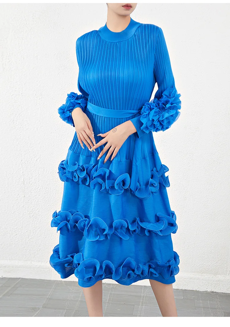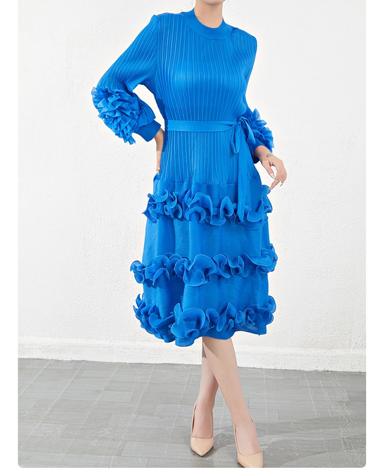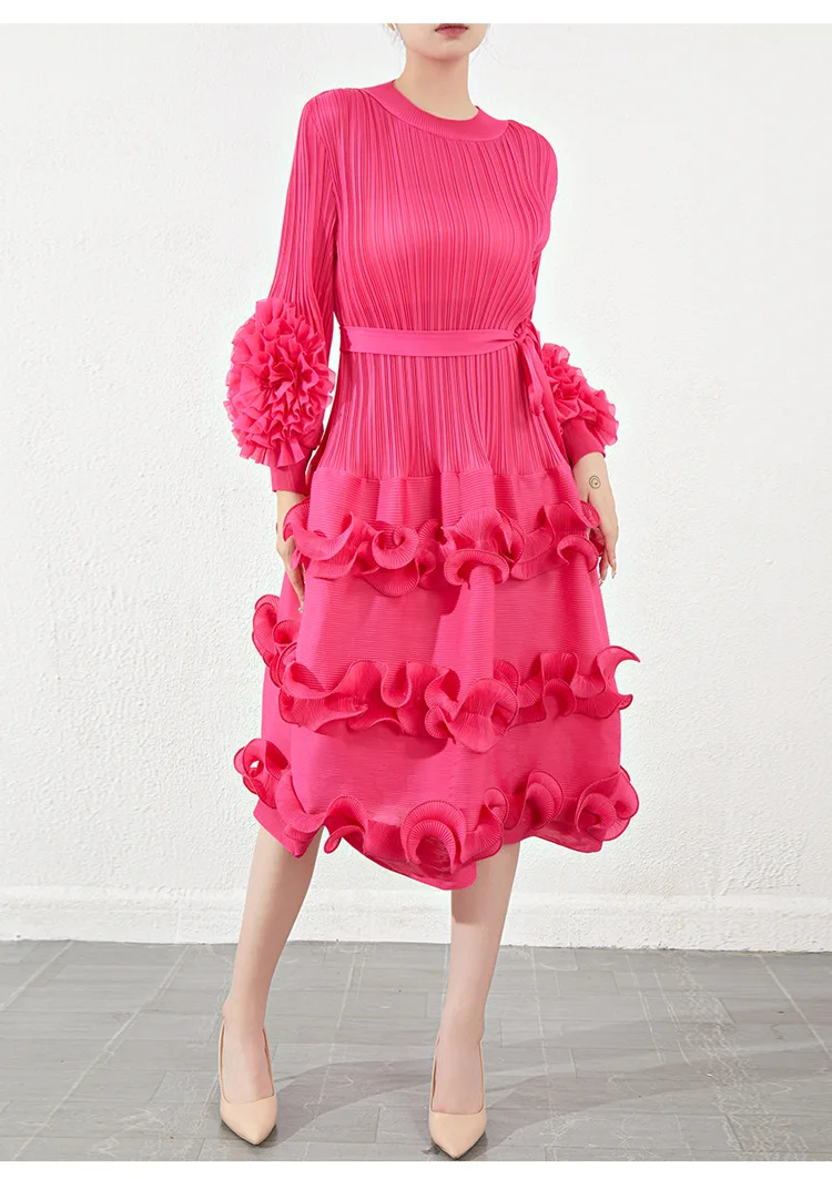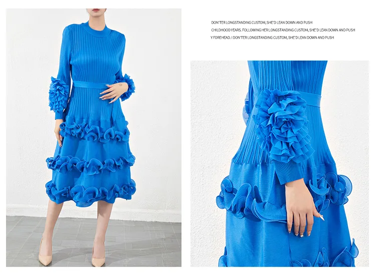 Introducing our best-selling Miyake Pleated Style Dress, perfect for the spring and autumn seasons. This dress features a comfortable round neck, loose and slim fit, and an eye-catching irregular cake skirt. Made with premium materials, it is designed to provide a perfect fit for all body types. Its one-size-fits-all design makes it a must-have for every wardrobe. The dress is 120cm in length with a chest circumference of 90cm-120cm, and sleeve and shoulder measurements of 50cm and 40cm respectively. With its stylish design and easy-to-wear fit, this dress is perfect for any occasion. Don't miss out on this exclusive limited time offer!