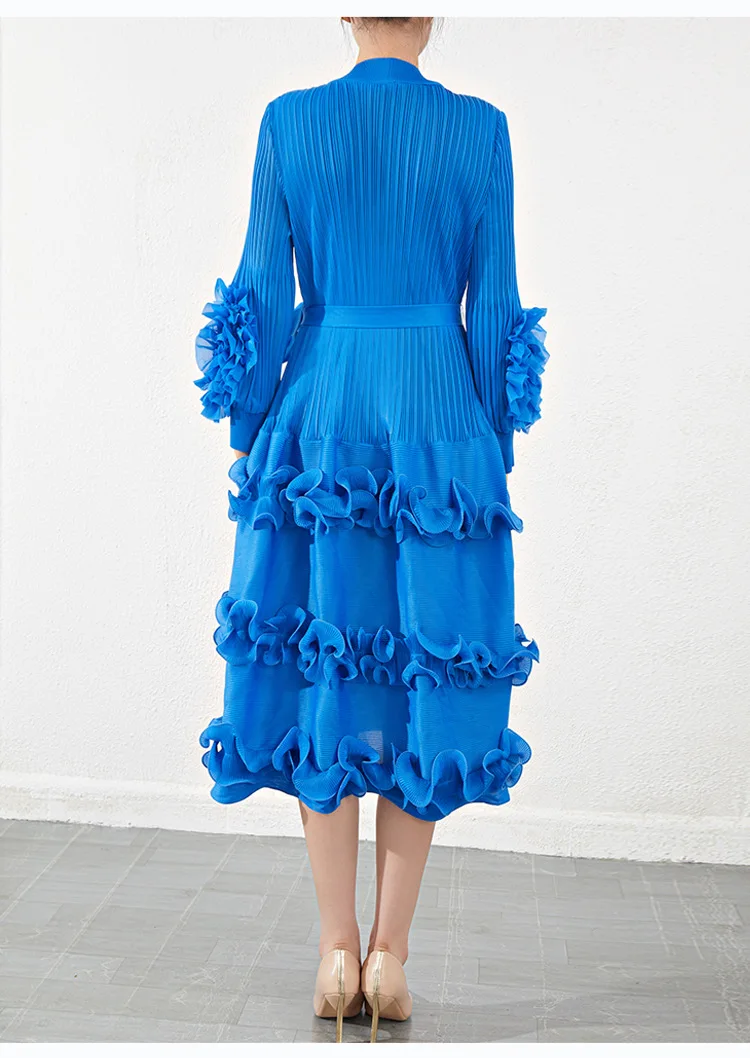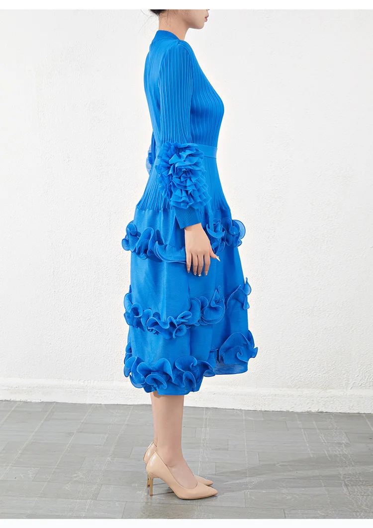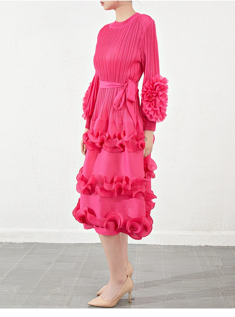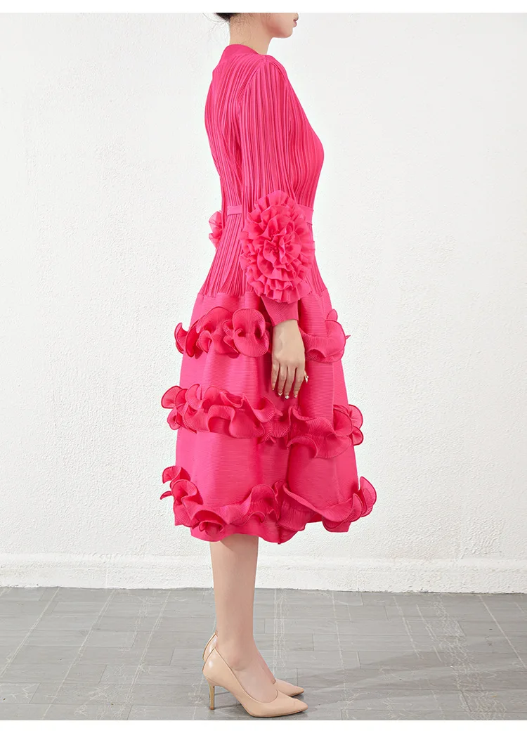 Introducing our best-selling Miyake Pleated Style Dress, perfect for the spring and autumn seasons. This dress features a comfortable round neck, loose and slim fit, and an eye-catching irregular cake skirt. Made with premium materials, it is designed to provide a perfect fit for all body types. Its one-size-fits-all design makes it a must-have for every wardrobe. The dress is 120cm in length with a chest circumference of 90cm-120cm, and sleeve and shoulder measurements of 50cm and 40cm respectively. With its stylish design and easy-to-wear fit, this dress is perfect for any occasion. Don't miss out on this exclusive limited time offer!