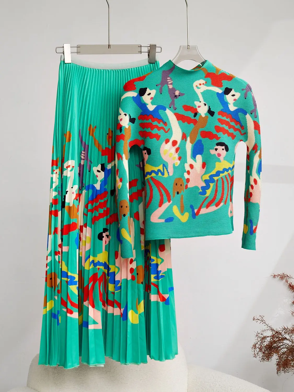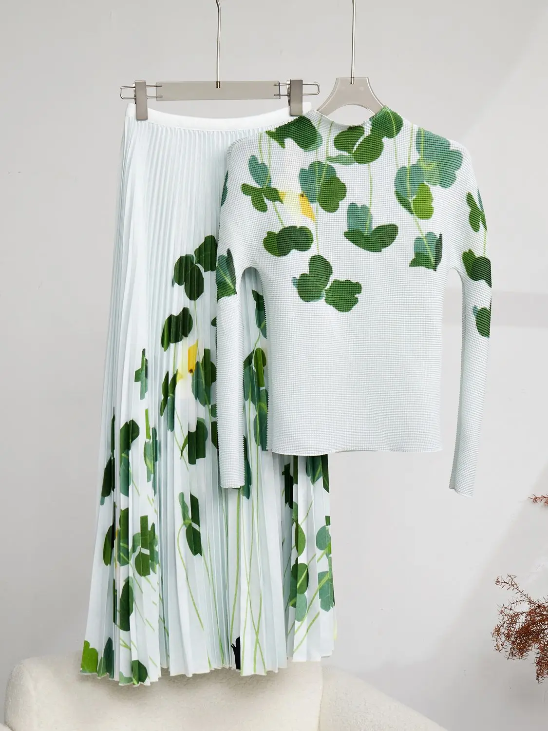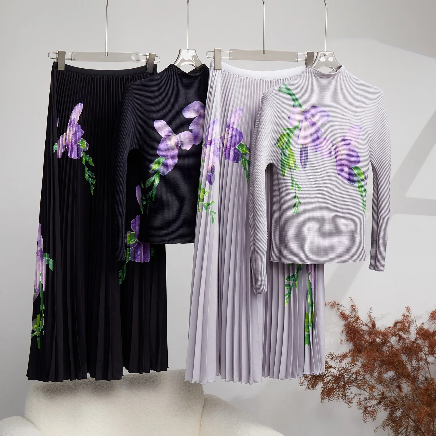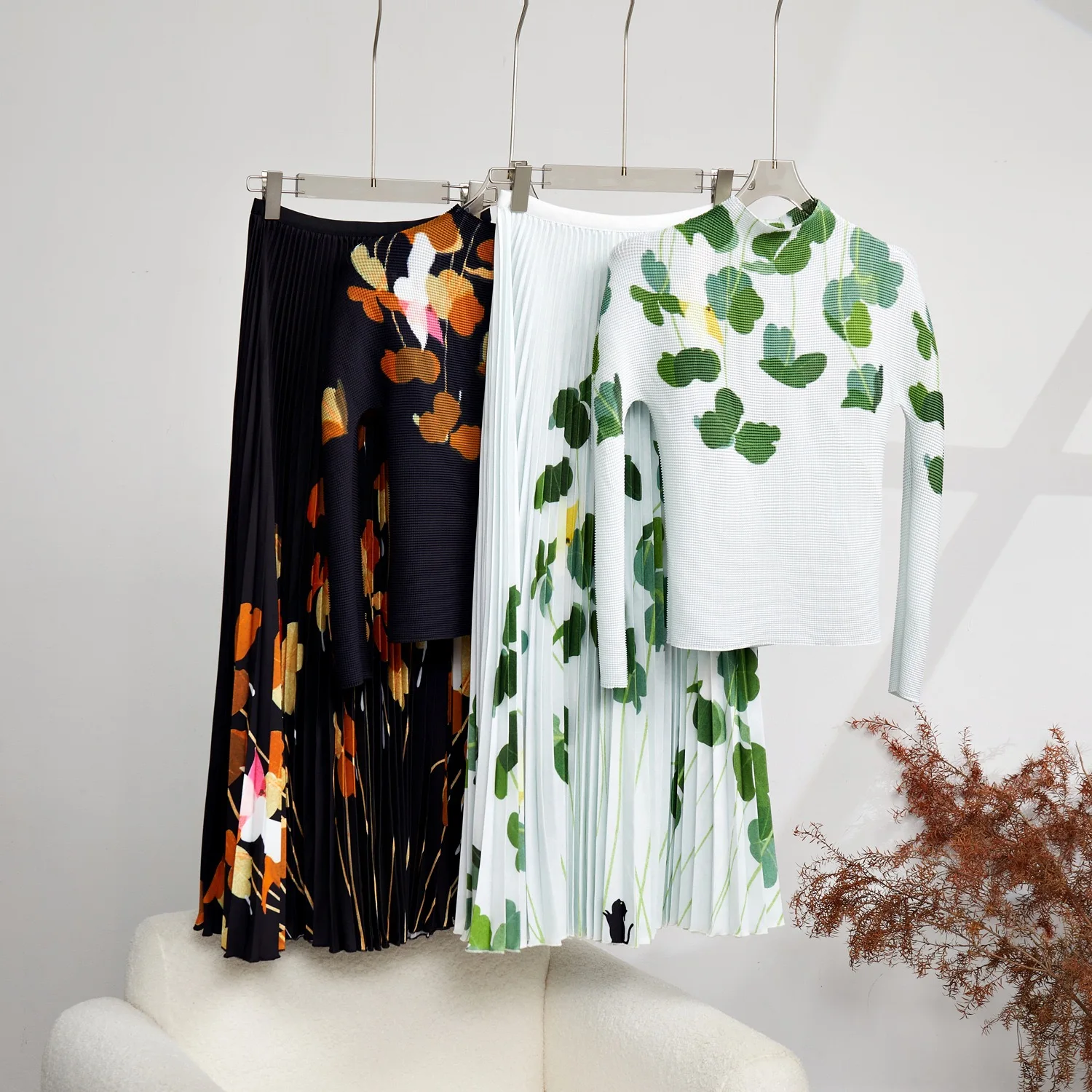 Introducing our latest fashion set for women - the perfect combination of style and comfort! This 2-piece set includes a beautifully pleated print top with a high collar and long sleeves, and a matching long skirt with high elasticity. The top has a bust measurement of 75-120cm and a length of 52-54cm, while the skirt has a waist measurement of 62-116cm and a length of 90cm. Say goodbye to the hassle of finding the perfect outfit for spring and autumn, as this set has got you covered. Made with premium materials, it offers the perfect fit and is a best seller among our customers. Don't miss out on this exclusive set, available for a limited time only. Elevate your wardrobe with this versatile and stylish set, perfect for any occasion.