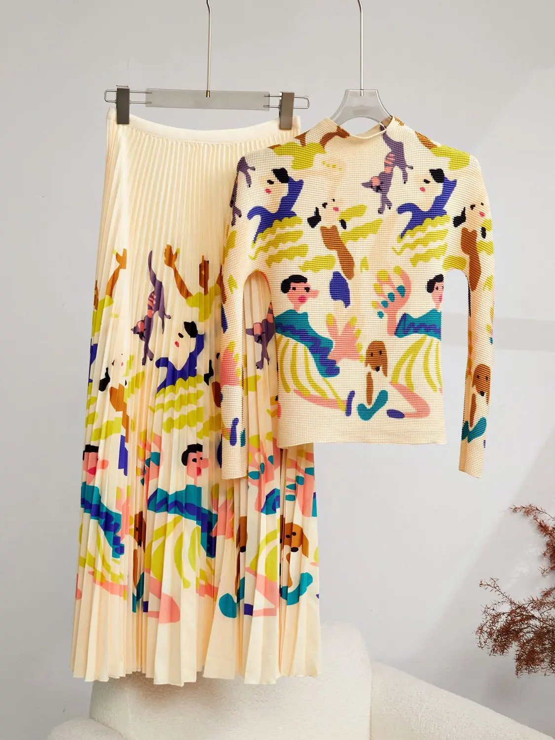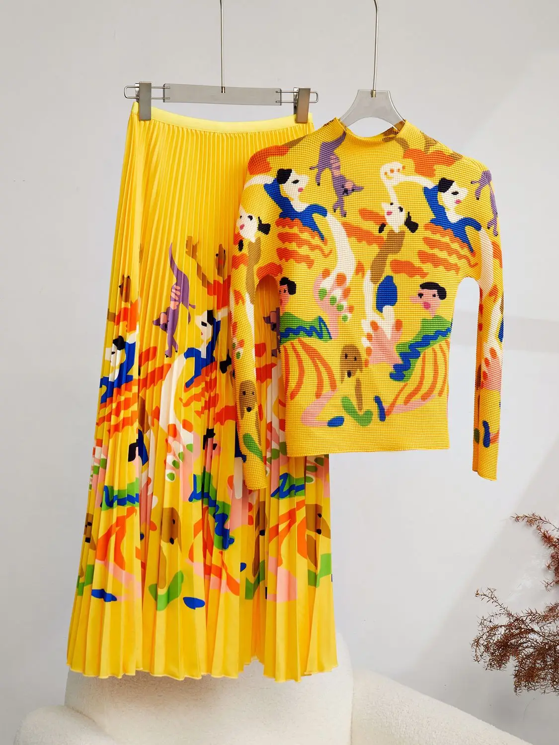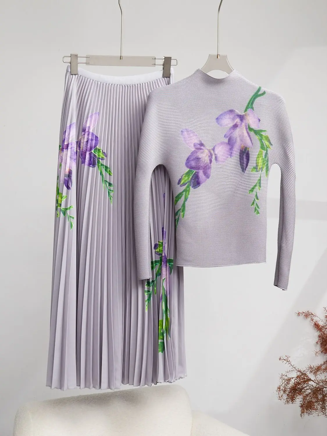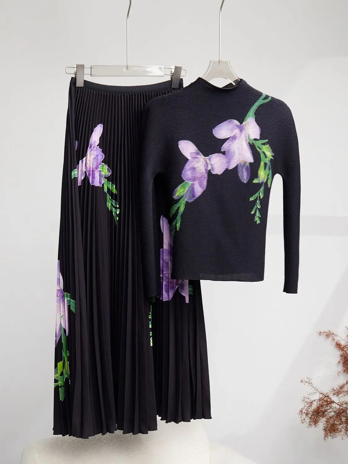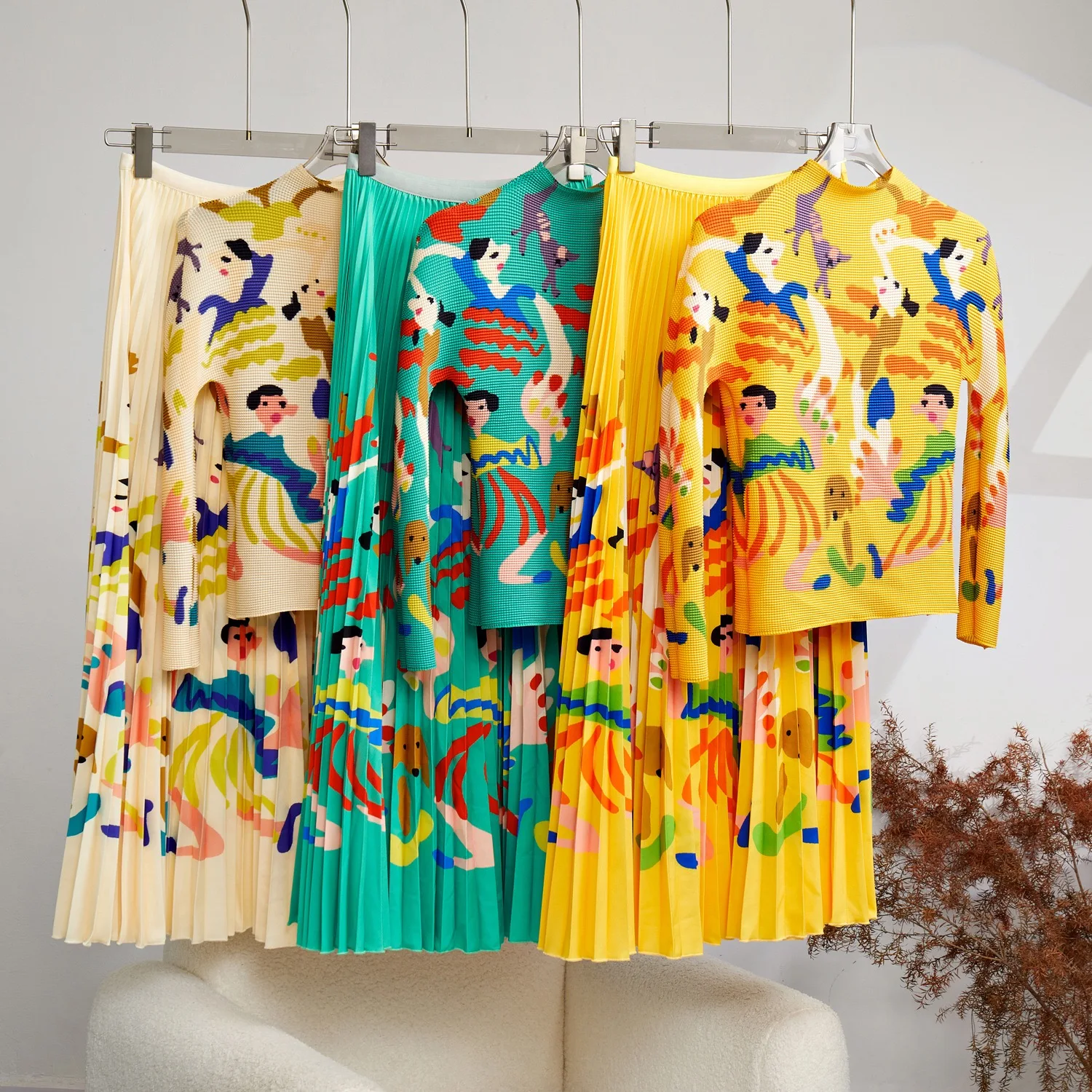 Introducing our latest fashion set for women - the perfect combination of style and comfort! This 2-piece set includes a beautifully pleated print top with a high collar and long sleeves, and a matching long skirt with high elasticity. The top has a bust measurement of 75-120cm and a length of 52-54cm, while the skirt has a waist measurement of 62-116cm and a length of 90cm. Say goodbye to the hassle of finding the perfect outfit for spring and autumn, as this set has got you covered. Made with premium materials, it offers the perfect fit and is a best seller among our customers. Don't miss out on this exclusive set, available for a limited time only. Elevate your wardrobe with this versatile and stylish set, perfect for any occasion.