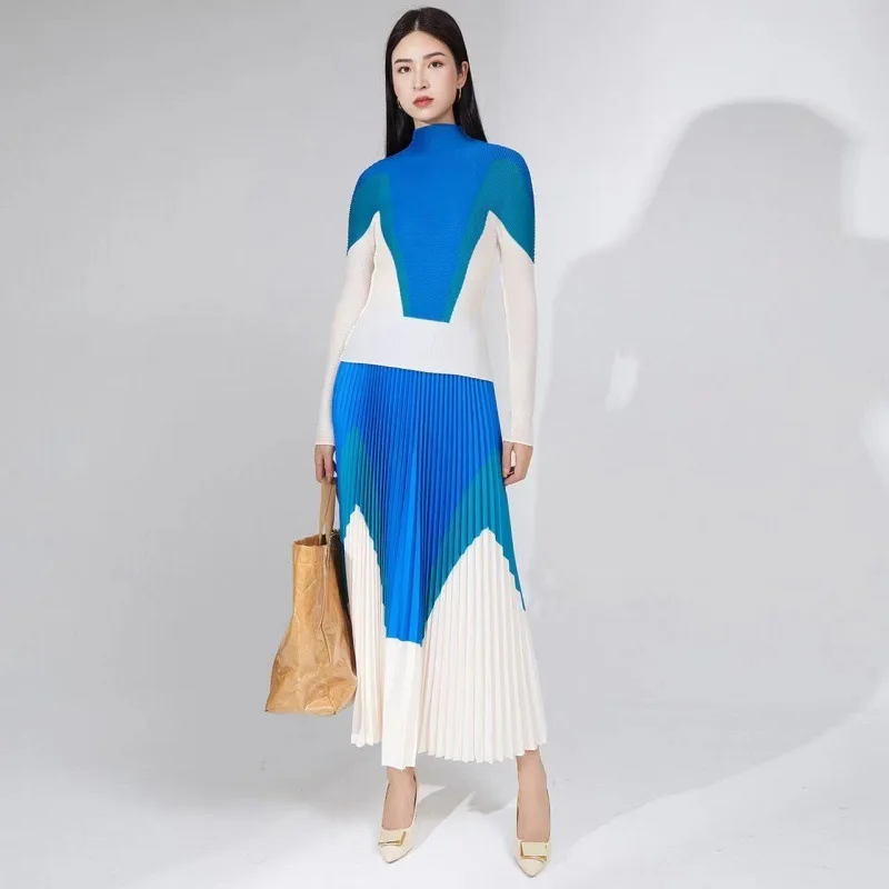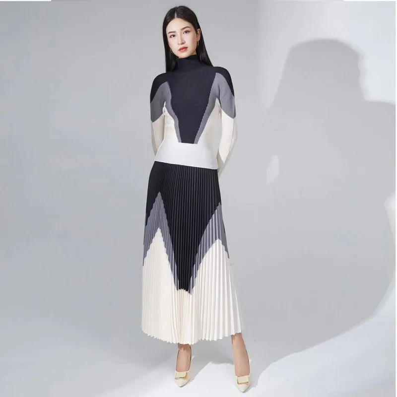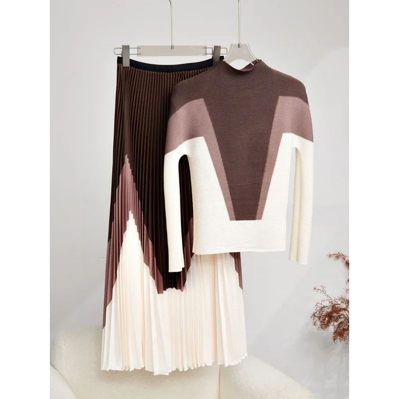 🌸 What it is - This stylish set includes a turtleneck top and an elastic waist A-line skirt, perfect for a casual yet fashionable look in the upcoming Autumn 2024 season.