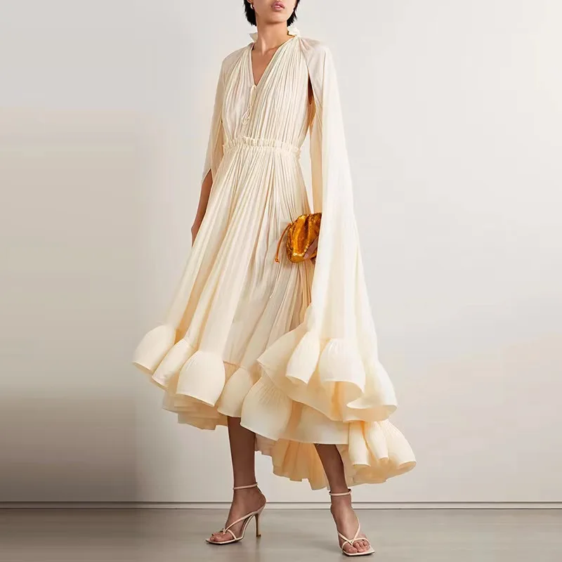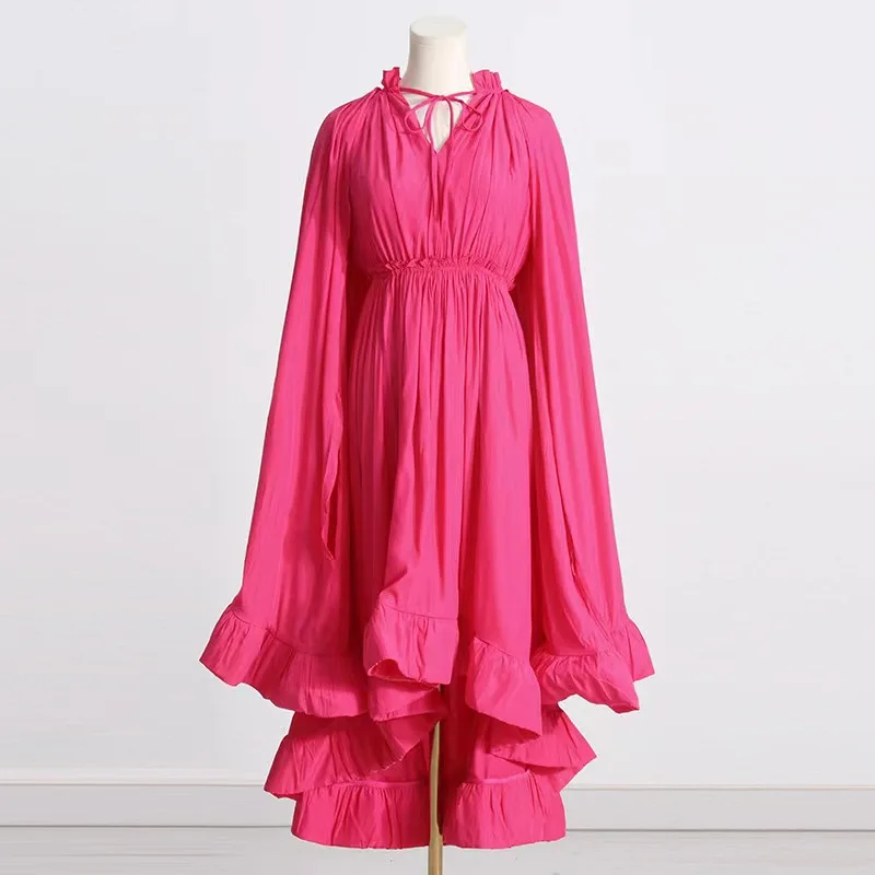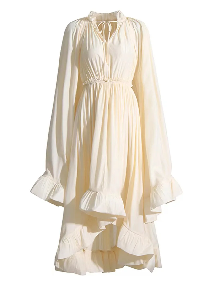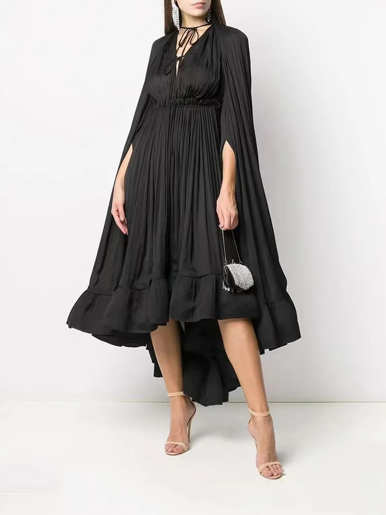 Introducing our Ruffles Irregular Solid Dress, the perfect addition to your summer wardrobe! This dress features a V-neckline and cloak sleeves, providing a flattering and feminine look. The high waist and spliced lace-up design add a touch of elegance, while the loose folds give a comfortable and relaxed fit. Made with premium quality materials, this dress is perfect for any occasion. Its one-size-fits-all design (1 inch = 2.54 cm, 1 cm = 0.39 inch) ensures a perfect fit for sizes 90-120. The lightweight fabric makes it easy to wear and care for, simply gently wash and it's ready to go. Don't miss out on this limited time best-seller, get your Ruffles Irregular Solid Dress today and elevate your summer style!