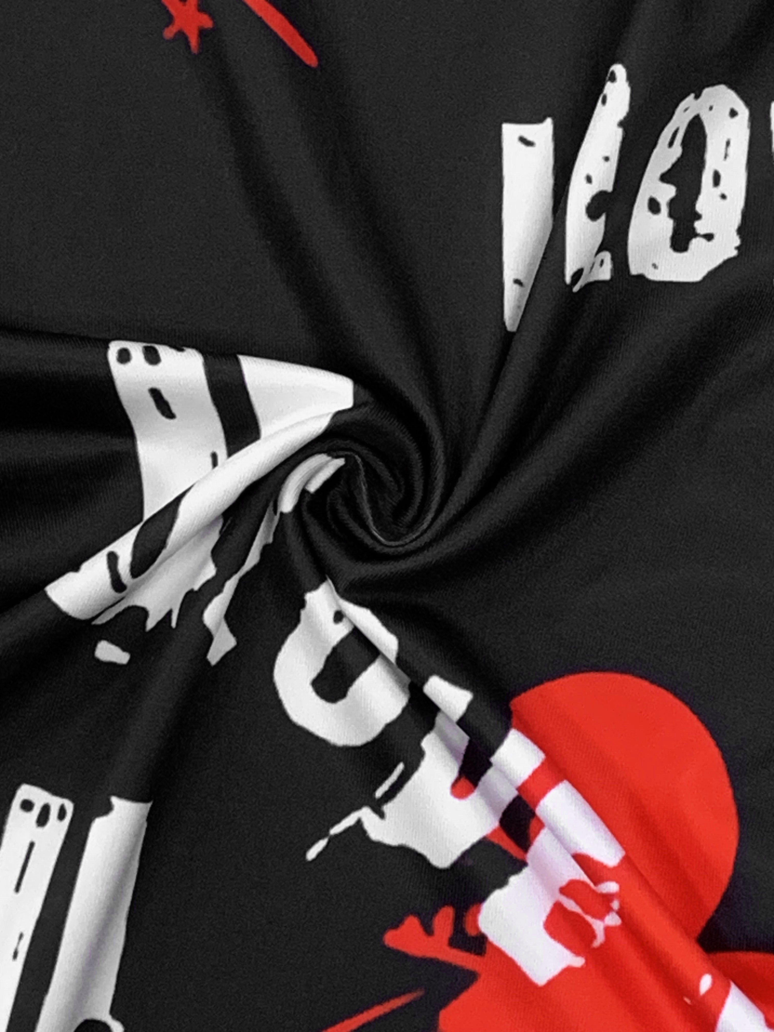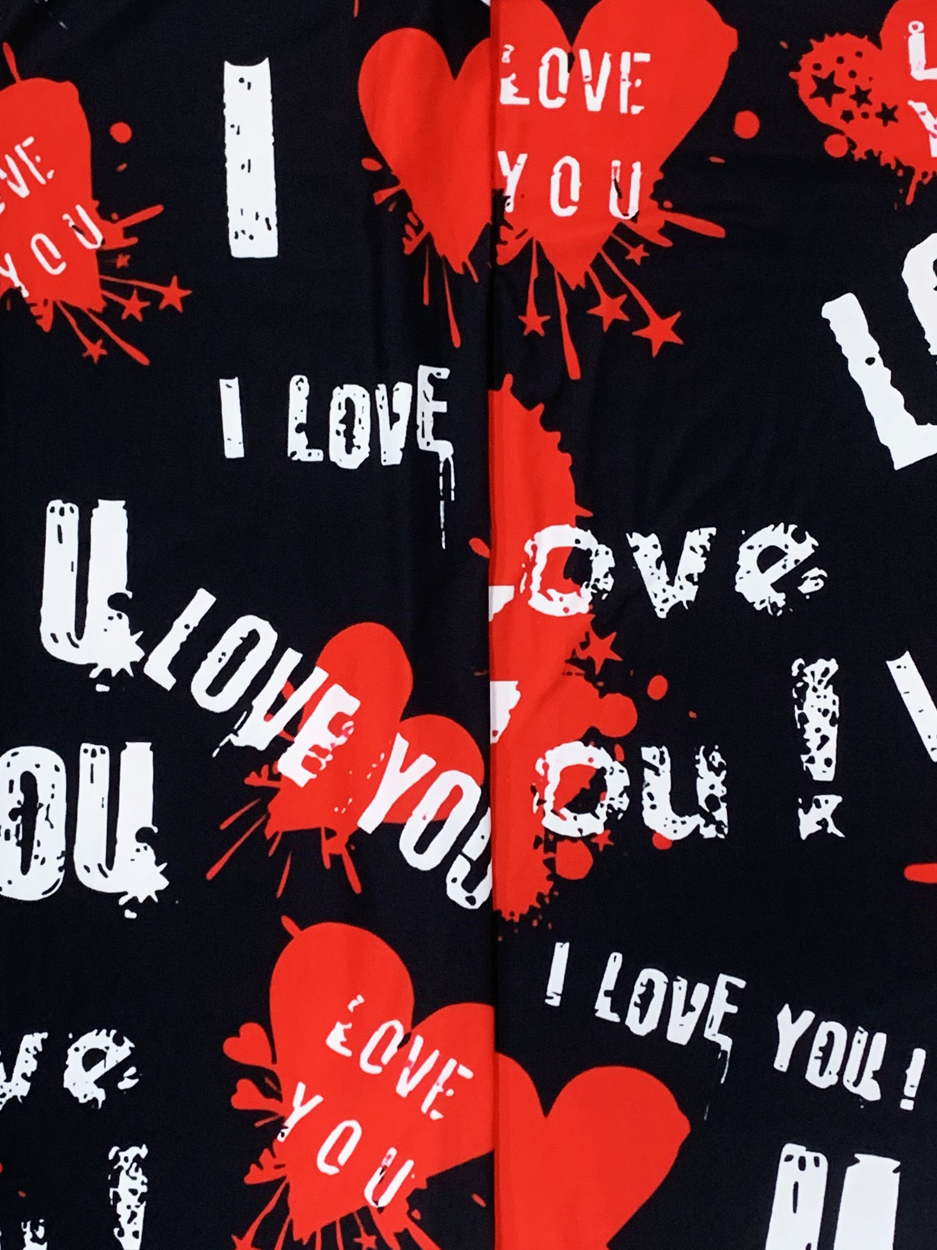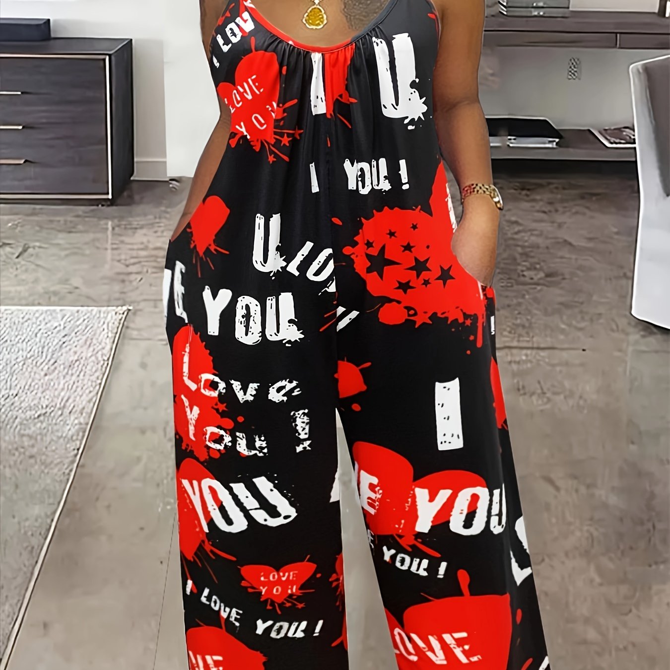 Women's Valentine's Day Jumpsuit, Plus Size Heart & Slogan Print Round Neck Wide Leg Cami Jumpsuit With Pockets