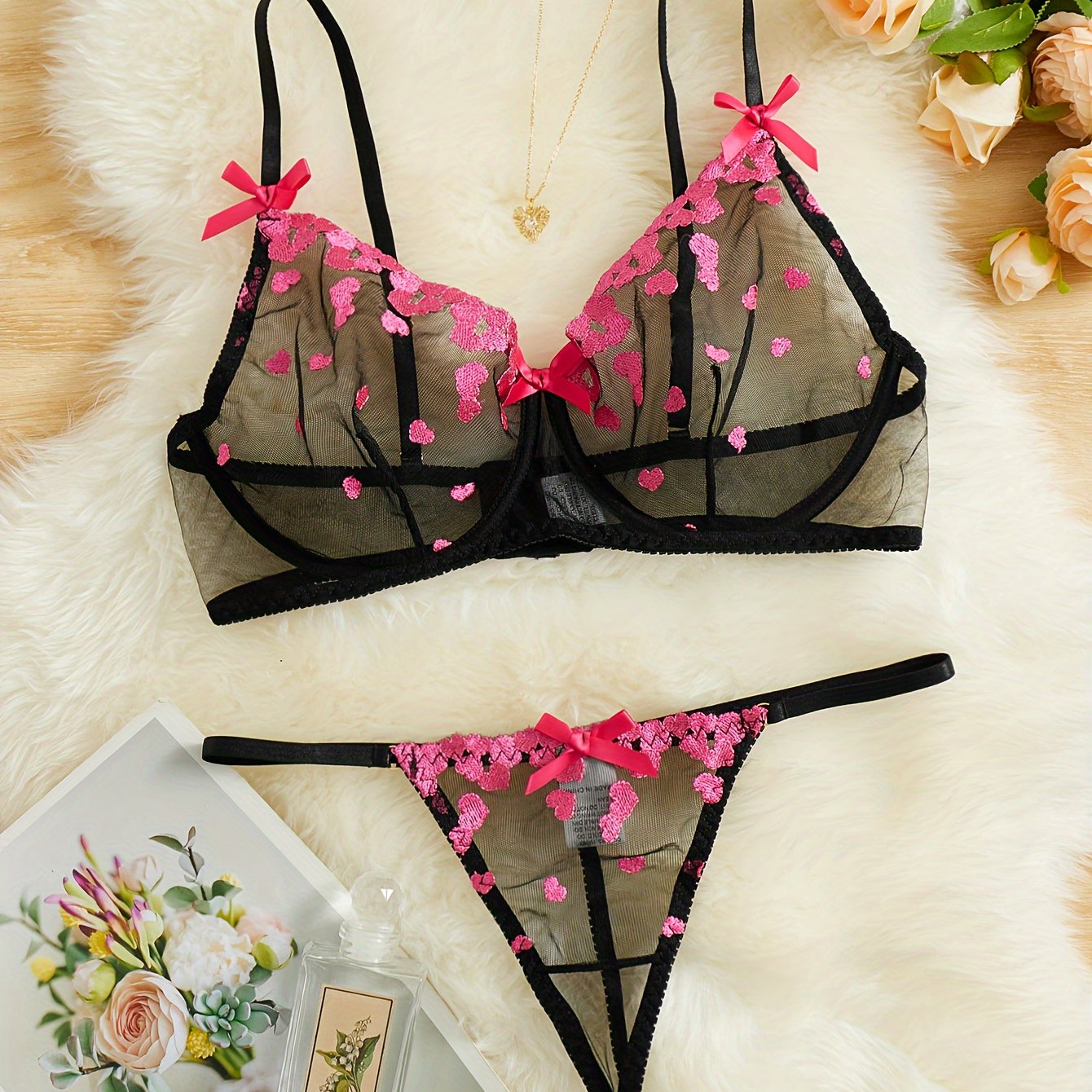 Women's Valentine's Day Sexy Lingerie Set, Plus Size Heart Embroidered Bow Decor Sheer Mesh Bra & Thong Lingerie 2 Piece Set
